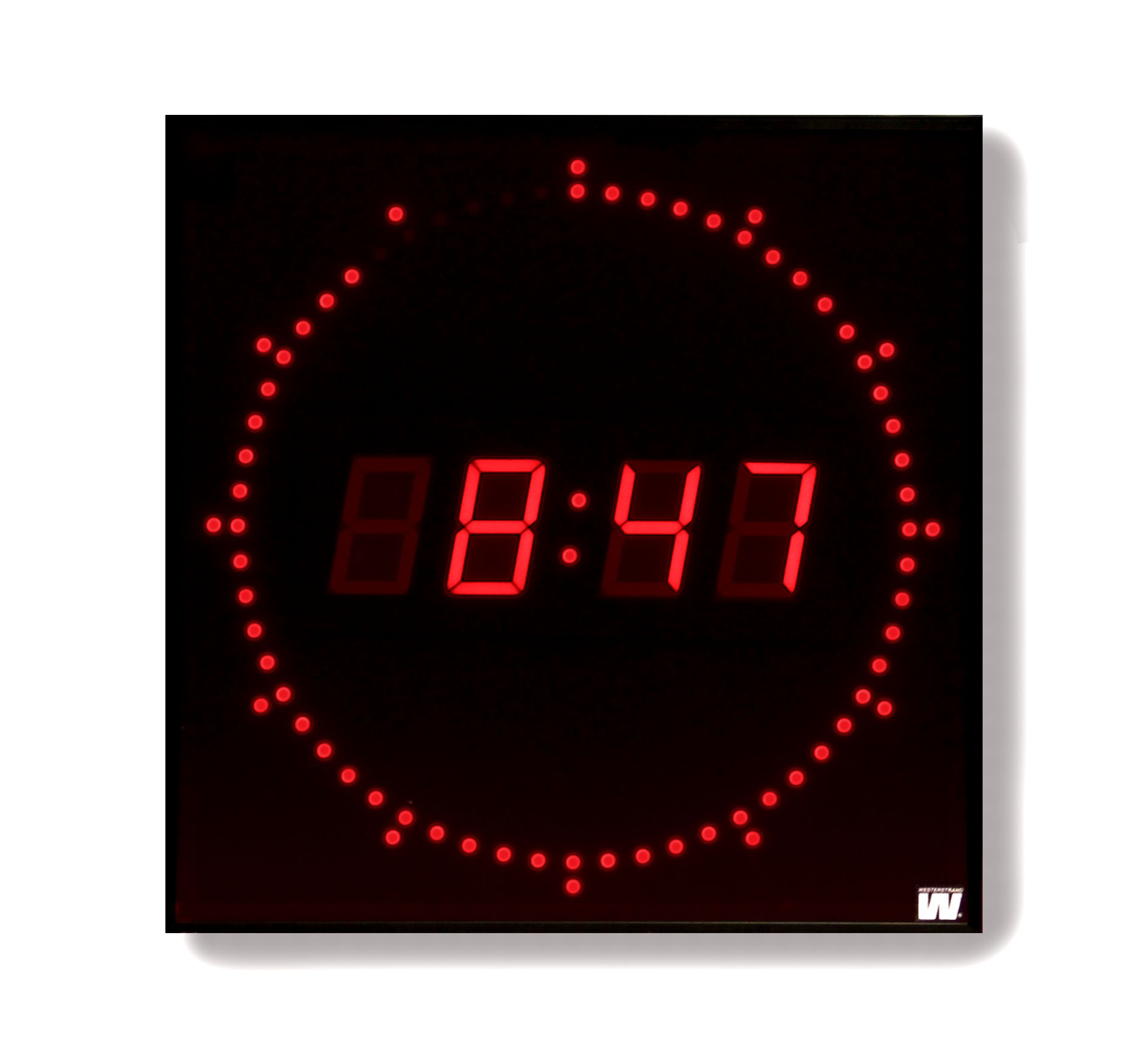 Digital indoor clock with a black painted aluminum housing and polycarbonate front. The sec. ring is available with red or green LEDs.